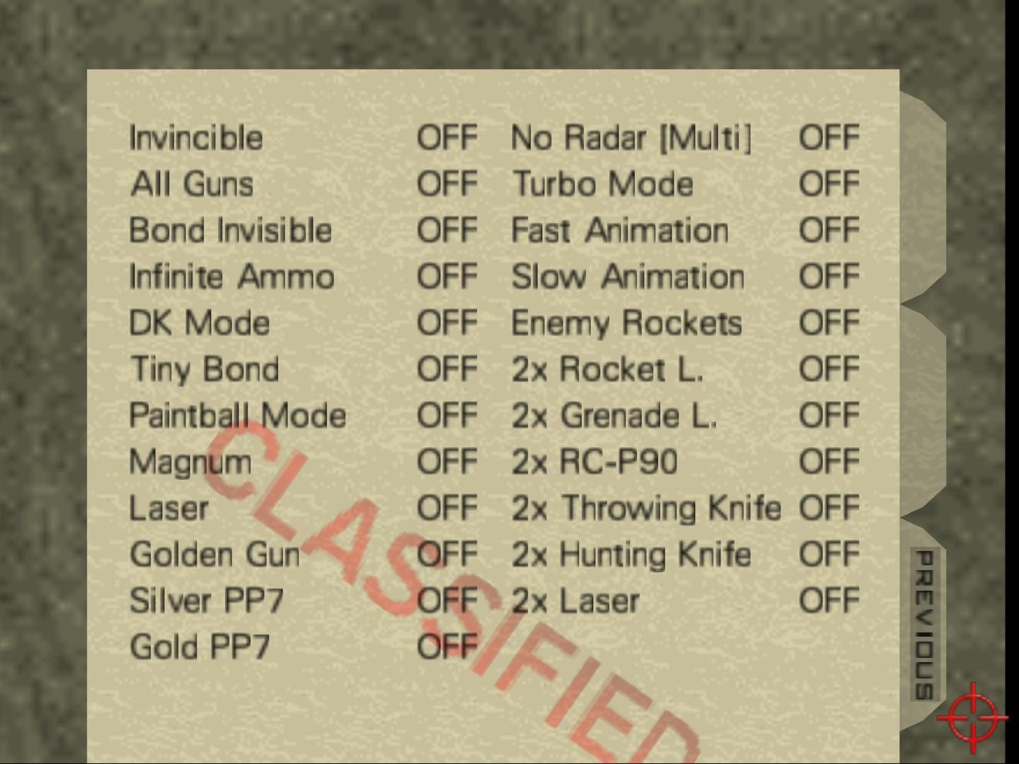 Cheat codes for goldeneye 007 on the nintendo 64.